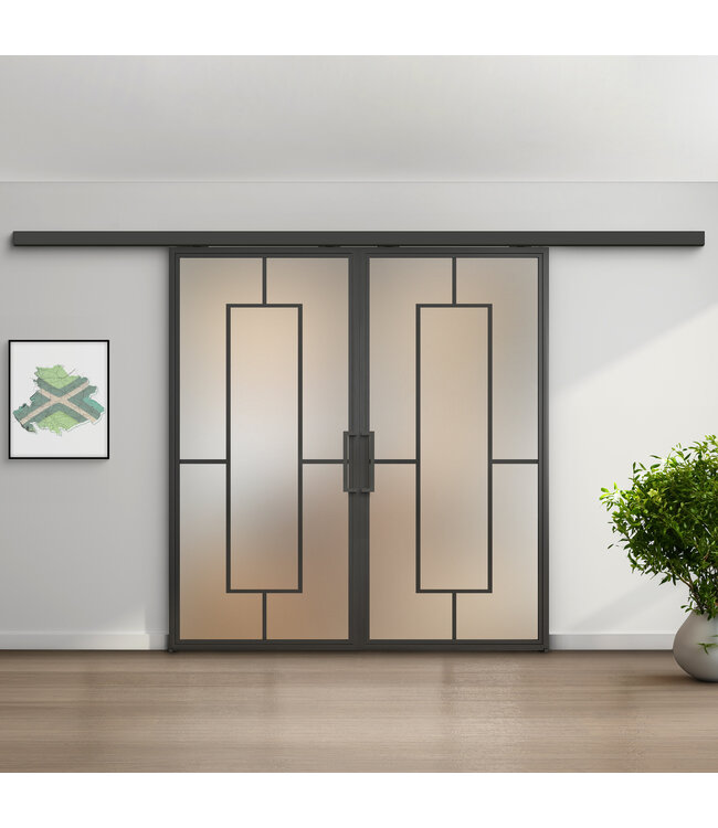Wil je je interieur een luxe upgrade geven? Dan zijn deze stalen schuifdeuren een zeer geschikte keuze. Het design combineert een ontwerp in matzwart (RAL 9005) met vijf vlakken van mat glas en is goed toe te passen in onder andere een moderne inrichting. De deuren schuiven soepel langs de wand en zijn voorzien van een duurzame, kras- en vochtwerende poedercoating voor langdurig gebruik. Deze schuifdeur zorgt voor sfeer en een ruimtelijk gevoel in huis. We hebben dit design ook beschikbaar met helder en rook glas.