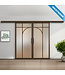 Geef je interieur een luxe make-over met deze stijlvolle stalen schuifdeuren in de kleur brons (RAL 8014) met mat glas en koofsysteem. De deuren hebben een organische uitstraling dankzij vijf glazen vakken per deur. Het glas laat natuurlijk licht door, wat een ruimtelijk gevoel geeft. Erg handig in kleinere ruimtes die je graag iets groter wil maken. De deur is beschikbaar in verschillende maten, waardoor hij in vrijwel iedere deurpost past. Naast dat de deur ruimte bespaart, doordat hij gemakkelijk langs de wand beweegt, biedt hij ook een duurzame oplossing door een kras- en vochtwerende poedercoating. Schuifdeuren zijn veelzijdig en kunnen worden gebruikt in verschillende ruimtes in het huis, waaronder slaapkamers, badkamers en kantoren. We hebben dit design ook beschikbaar met helder, rook en brons rook glas.