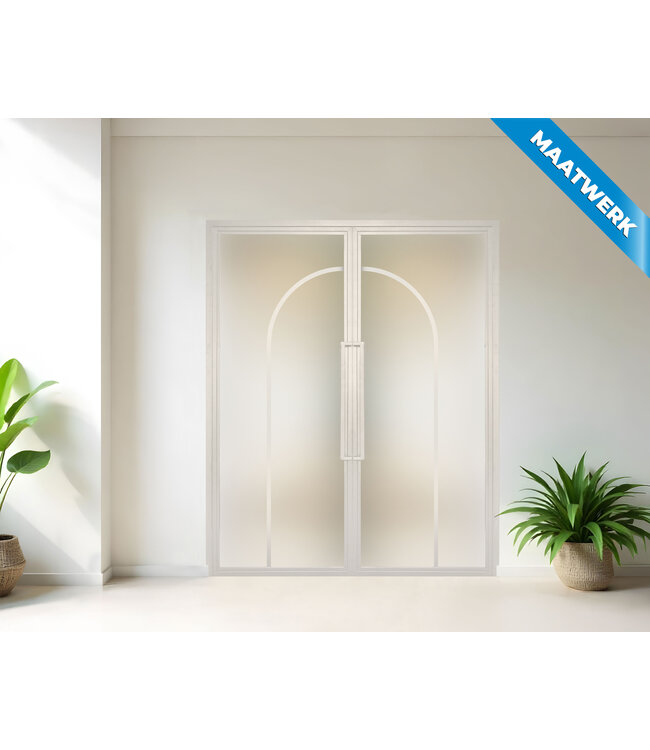 Wil je een stijlvolle uitstraling geven aan je interieur? Dan is deze stalen binnendeur een perfecte keuze! Deze dubbele deur is gemaakt van hoogwaardig staal met mat glas en heeft twee vlakken. De deur combineert een strak wit ontwerp (RAL 9010) met zachte ronde vormen en is goed toe te passen in onder andere een moderne, Scandinavische of Japandi inrichting. Deze stalen binnendeur zorgt voor sfeer en een ruimtelijk gevoel in huis. De deur is verkrijgbaar in standaardmaten en wordt geleverd inclusief kozijn. Je kunt de deur dus eenvoudig in je muuropening plaatsen. We hebben deze deur ook beschikbaar met helder en rook glas.