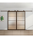 Geef je interieur een moderne make-over met deze stijlvolle in brons (RAL 8014) stalen schuifdeuren met mat glas. De deuren hebben een eigentijdse uitstraling dankzij de vier glazen vakken. Het matte glas laat natuurlijk licht door, wat een ruimtelijk gevoel geeft in elke kamer. Erg handig in kleinere ruimtes die je graag iets groter wilt maken. We hebben de deuren niet alleen met mat glas in ons assortiment, maar ook met helder of (brons) rook glas.