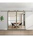 Voor de montage van het standaard meegeleverde schuifdeursysteem (rails en rollers) heb je 13cm ruimte boven de deur nodig. De deur dient 1cm boven de grond gemonteerd te worden in combinatie met de deurgeleider. In totaal moet je dus 13cm + 1cm +deurhoogte aan ruimte hebben om de deur te kunnen monteren. Tot slot moet de stalen schuifdeur in de breedte minimaal 1,5cm aan weerszijde van de deuropening uitsteken om de deuropening tochtvrij af te kunnen sluiten en is er 2,6cm ruimte nodig tussen de deur en muur. Plafondbeugels worden niet standaard mee geleverd. Twijfel je of jouw muur de schuifdeur kan dragen? Neem dan gerust contact met ons op.