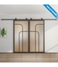 Voor de montage van het standaard meegeleverde schuifdeursysteem (rails en rollers) heb je 13cm ruimte boven de deur nodig. De deur dient 1cm boven de grond gemonteerd te worden in combinatie met de deurgeleider. In totaal moet je dus 13cm + 1cm +deurhoogte aan ruimte hebben om de deur te kunnen monteren. Tot slot moet de stalen schuifdeur in de breedte minimaal 1,5cm aan weerszijde van de deuropening uitsteken om de deuropening tochtvrij af te kunnen sluiten en is er 2,6cm ruimte nodig tussen de deur en muur. Plafondbeugels worden niet standaard mee geleverd. Twijfel je of jouw muur de schuifdeur kan dragen? Neem dan gerust contact met ons op.
