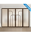 Bij drie gemeten sparingbreedtes van bijvoorbeeld 220 cm, 220,3 cm en 219,8 cm, geef je 219,8 cm op als sparingsbreedte. Tijdens het bestellen geef je de breedte van de deuren aan, op basis hiervan bepalen wij de maten van de glaspanelen. Voor het berekenen van de maten van de zijpanelen gebruiken wij de sparingsbreedte en de deurbreedte.