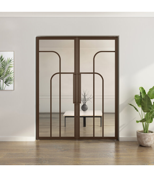 Ben je op zoek naar een stijlvolle manier om je interieur te upgraden? Ga dan voor deze dubbele hydraulische taatsdeur met helder glas. De deuren zijn gemaakt van hoogwaardig staal in brons (RAL 8014) en hebben een organische uitstraling dankzij vier ronde vlakken. Het moderne ontwerp zorgt voor een ruimtelijk gevoel in je huis. Ideaal wanneer je op zoek bent om je interieur een luxe uitstraling te geven. De deuren hebben een zelfsluitend hydraulisch systeem, dus na het openen van de deuren zullen ze weer geruisloos sluiten. Je kunt zelf instellen hoe sterk de zelfsluiting is en de deur stellen middels het vloerscharnier. We hebben dit design ook beschikbaar met mat, rook en brons rook glas.