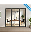 Bij drie gemeten sparingbreedtes van bijvoorbeeld 220 cm, 220,3 cm en 219,8 cm, geef je 219,8 cm op als sparingsbreedte. Tijdens het bestellen geef je de breedte van de deuren aan, op basis hiervan bepalen wij de maten van de glaspanelen. Voor het berekenen van de maten van de zijpanelen gebruiken wij de sparingsbreedte en de deurbreedte.