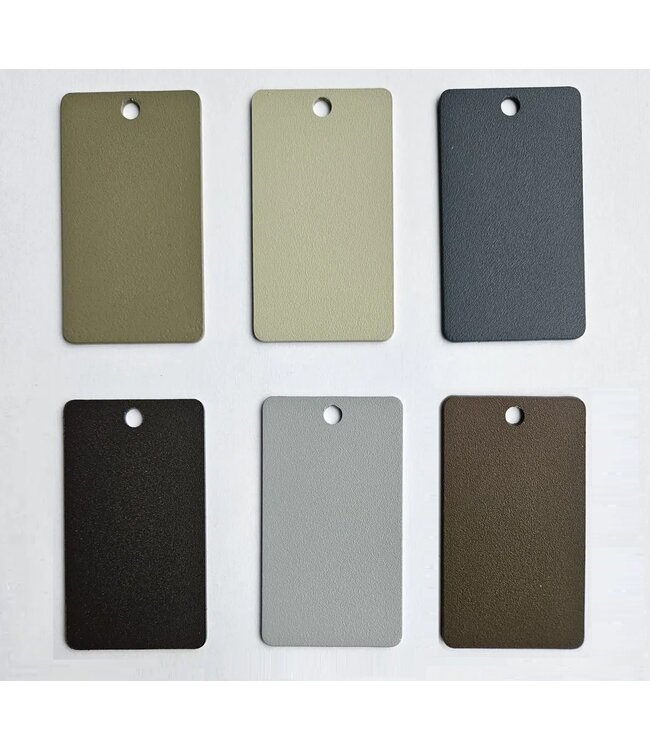 Op deze pagina kunt u een kleurstaaltje bestellen in de kleuren brons (RAL8014), olijfgroen (RAL7002), Kiezelgrijs (RAL7032), Grijsblauw (RAL5008), Venstergrijs (RAL7040), Zuiver wit (RAL9010), zwart (RAL9005).