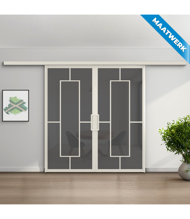 Wil je je interieur of zakelijke ruimte een luxe upgrade geven? Dan is deze dubbele stalen schuifdeur een perfecte keuze. Het design combineert een ontwerp in wit (RAL 9010) met vijf vlakken van rook glas en is goed toe te passen in onder andere een moderne inrichting. De deuren zorgen voor sfeer en een ruimtelijk gevoel in huis. Deze schuifdeuren schuiven soepel langs de wand en zijn voorzien van een duurzame, kras- en vochtwerende poedercoating voor langdurig gebruik. We hebben dit design ook beschikbaar met helder en mat glas.