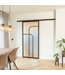 Upgrade je interieur met deze stijlvolle stalen schuifdeur in de kleur brons (RAL 8014) met mat glas en koofsysteem. De deur heeft een organische en moderne uitstraling dankzij de vier glazen vlakken. Het glas laat natuurlijk licht door, wat een ruimtelijk gevoel geeft in elke kamer. Erg handig in kleinere ruimtes die je graag iets groter wil maken. We hebben dit design ook beschikbaar met helder, rook en brons rook glas.