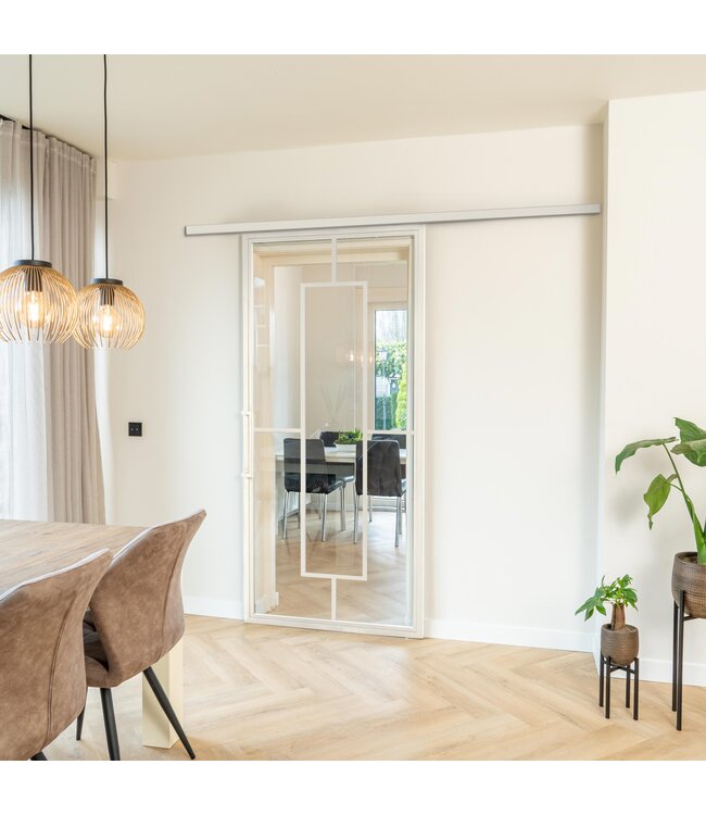 Wil je je interieur een luxe upgrade geven? Dan is deze stalen schuifdeur een zeer geschikte keuze. Het design combineert een ontwerp in wit (RAL 9010) met vijf vlakken van helder glas en is goed toe te passen in onder andere een moderne inrichting. De deur schuift soepel langs de wand en is voorzien van een duurzame, kras- en vochtwerende poedercoating voor langdurig gebruik. Deze schuifdeur zorgt voor sfeer en een ruimtelijk gevoel in huis. We hebben dit design ook beschikbaar met mat en rook glas.