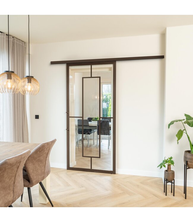 Wil je je interieur een luxe upgrade geven? Dan is deze stalen schuifdeur een zeer geschikte keuze. Het design combineert een ontwerp in de kleur brons (RAL 8014) met vijf vlakken van helder glas en is goed toe te passen in onder andere een moderne inrichting. De deur schuift soepel langs de wand en is voorzien van een duurzame, kras- en vochtwerende poedercoating voor langdurig gebruik. Deze schuifdeur zorgt voor sfeer en een ruimtelijk gevoel in huis. We hebben dit design ook beschikbaar met mat, rook en brons rook glas.
