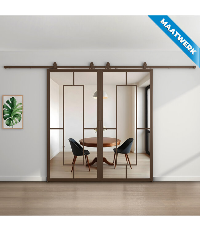 Wil je je interieur een luxe upgrade geven? Dan is deze dubbele stalen schuifdeur een perfecte keuze. Het design combineert een bronzen ontwerp (RAL 8014) met vijf glazen vlakken van helder glas en is goed toe te passen in onder andere een moderne inrichting. Deze schuifdeur zorgt voor sfeer en een ruimtelijk gevoel in huis. De deur schuift soepel langs de wand en is voorzien van een duurzame, kras- en vochtwerende poedercoating voor langdurig gebruik. We hebben dit design ook beschikbaar met mat, rook en brons rook glas.