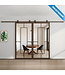Voor de montage van het standaard meegeleverde schuifdeursysteem (rails en rollers) heb je 13cm ruimte boven de deur nodig. De deur dient 1cm boven de grond gemonteerd te worden in combinatie met de deurgeleider. In totaal moet je dus 13cm + 1cm +deurhoogte aan ruimte hebben om de deur te kunnen monteren. Tot slot moet de stalen schuifdeur in de breedte minimaal 1,5cm aan weerszijde van de deuropening uitsteken om de deuropening tochtvrij af te kunnen sluiten en is er 2,6cm ruimte nodig tussen de deur en muur. Plafondbeugels worden niet standaard mee geleverd. Twijfel je of jouw muur de schuifdeur kan dragen? Neem dan gerust contact met ons op.