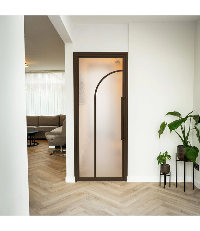 Geef je interieur of zakelijke ruimte een luxe upgrade met deze binnendeur, gemaakt van hoogwaardig staal in de kleur brons (RAL 8014) met twee ronde vlakken van kathedraalglas. Het glas heeft een subtiele structuur die een warme en karaktervolle uitstraling geeft. De combinatie van modern en organisch zorgt ervoor dat het design goed toe te passen is in verschillende interieurstijlen. Deze stalen binnendeur zorgt voor sfeer en een ruimtelijk gevoel in huis. De deur is verkrijgbaar in standaardmaten en wordt geleverd inclusief kozijn. Je kunt de deur eenvoudig in je muuropening plaatsen. We hebben dit model ook beschikbaar met helder, mat-, rook-, bronsrook- en kanaalglas.