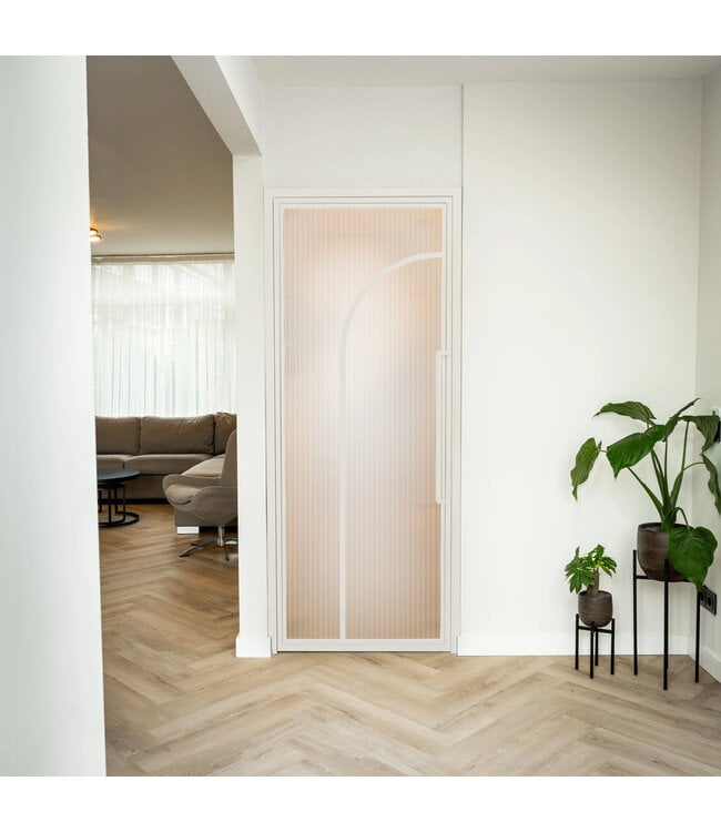 Geef je interieur of zakelijke ruimte een luxe upgrade met deze binnendeur, gemaakt van hoogwaardig staal in wit (RAL 9010) met twee ronde vlakken van kanaalglas. Kanaalglas is een glassoort met een langgerekte, verticale structuur. Deze fijne lijnen zorgen ervoor dat licht egaal wordt verspreid, terwijl het tegelijkertijd privacy biedt. De combinatie van modern en organisch zorgt ervoor dat dit design goed toe te passen is in verschillende interieurstijlen. Deze stalen binnendeur zorgt voor sfeer en een ruimtelijk gevoel in huis. De deur is verkrijgbaar in standaardmaten en wordt geleverd inclusief kozijn. Je kunt de deur eenvoudig in je muuropening plaatsen. We hebben dit model ook beschikbaar met helder, mat, rook- en kathedraalglas.