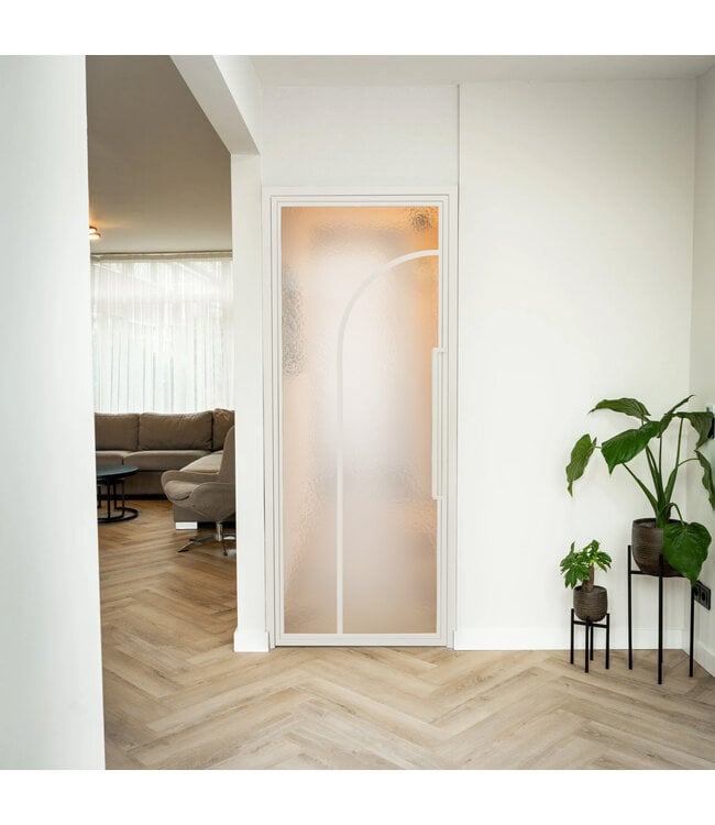 Geef je interieur of zakelijke ruimte een luxe upgrade met deze binnendeur, gemaakt van hoogwaardig staal in wit (RAL 9010) met twee ronde vlakken van kathedraalglas. Het glas heeft een subtiele structuur die een warme en karaktervolle uitstraling geeft. De combinatie van modern en organisch zorgt ervoor dat het design goed toe te passen is in verschillende interieurstijlen. Deze stalen binnendeur zorgt voor sfeer en een ruimtelijk gevoel in huis. De deur is verkrijgbaar in standaardmaten en wordt geleverd inclusief kozijn. Je kunt de deur eenvoudig in je muuropening plaatsen. We hebben dit model ook beschikbaar met helder, mat, rook- en kanaalglas.
