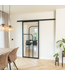Upgrade je interieur met deze stijlvolle mat zwarte stalen schuifdeur (RAL 9005) met mat glas en koofsysteem. De deur heeft een organische en moderne uitstraling dankzij de vier glazen vlakken. Het glas laat natuurlijk licht door, wat een ruimtelijk gevoel geeft in elke kamer. Erg handig in kleinere ruimtes die je graag iets groter wil maken. We hebben dit design ook beschikbaar met helder en rook glas.