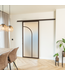 Geef je interieur een unieke make-over met deze stijlvolle stalen schuifdeur in de kleur brons (RAL 8014) met mat glas en koofsysteem. De deur heeft een organische en moderne uitstraling dankzij de twee glazen vlakken. Het glas laat natuurlijk licht door, wat een ruimtelijk gevoel geeft in elke kamer. Erg handig in kleinere ruimtes die je graag iets groter wil maken. We hebben dit design ook beschikbaar met helder, rook en brons rook glas.